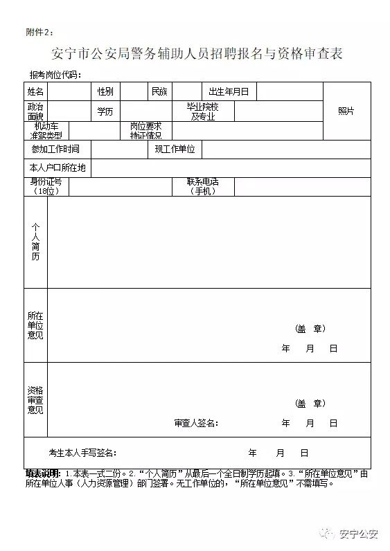 3.報名時需繳納報名費(fèi)50元,并提交《安寧市公安局警務(wù)輔助人員招聘報名與資格審查表》(附后)一式兩份(自行插入電子照片填寫基本信息后打印并簽名蓋章,報名時提交),攜帶本人身份證、畢業(yè)證及崗位要求的其他證明材料原件及復(fù)印件1份。提供虛假材料的,一經(jīng)查實,取消報考人考試和聘用資格。