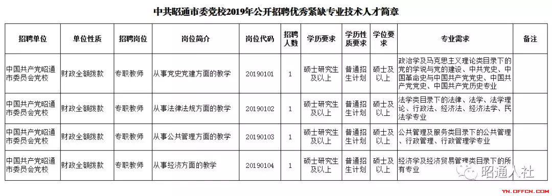 根據《昭通市事業單位公開招聘優秀緊缺專業技術人才實施意見》(昭人社發〔2015〕3號)等有關文件規定,結合市委黨校工作需要,經昭通市委組織部、昭通市人力資源和社會保障局批準,昭通市委黨校2019年計劃面向社會公開招聘優秀緊缺人才4名。現將公開招聘優秀緊缺人才的有關事宜通告如下: