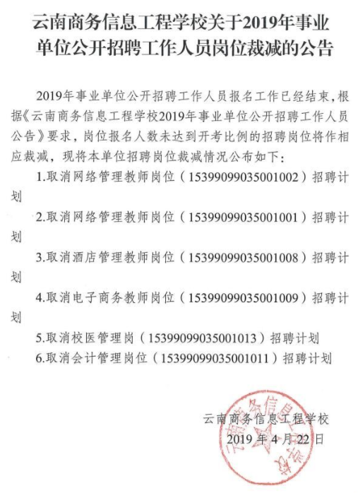 2019年云南商務信息工程學校事業單位招聘崗位裁減公告已公布,
