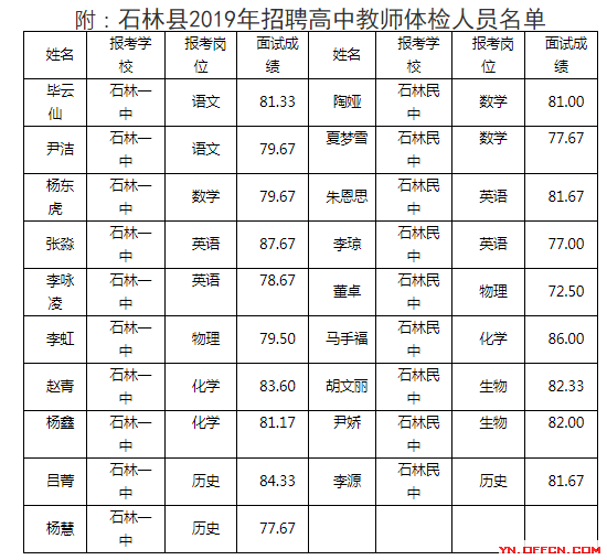 根據《中共石林彝族自治縣委石林彝族自治縣人民政府關于深化新時代教師隊伍建設改革實施意見》(石發〔2019〕5號)精神,按照《石林彝族自治縣2019年公開招聘高中教師公告》要求,通過網上報名、資格審查、面試及成績公示等程序,經研究,現將有關體檢事項通知如下: