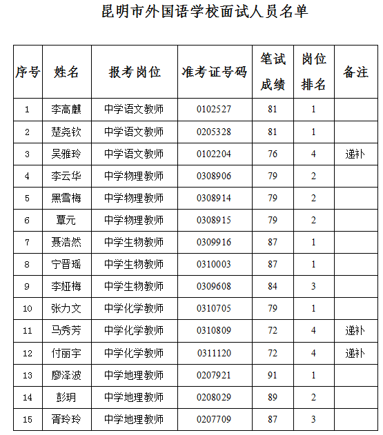 經(jīng)公示無異議的,依據(jù)考試成績,在合格分?jǐn)?shù)線上從高分到低分按崗位擬招聘人數(shù)1 :1的比例確定參加考察和體檢人選。由昆明市外國語學(xué)校負(fù)責(zé)電話通知考生,并統(tǒng)一組織考察和體檢。
